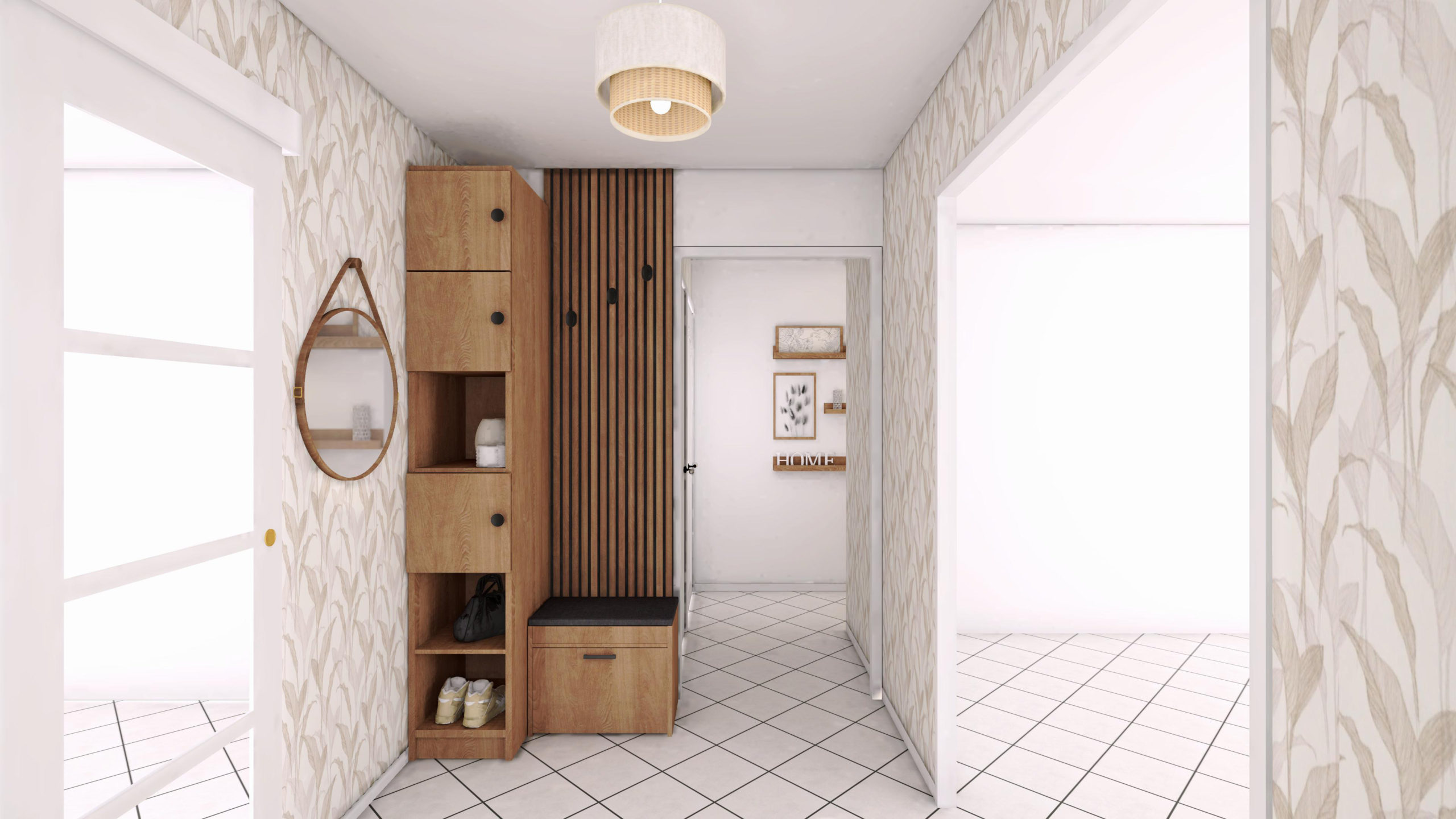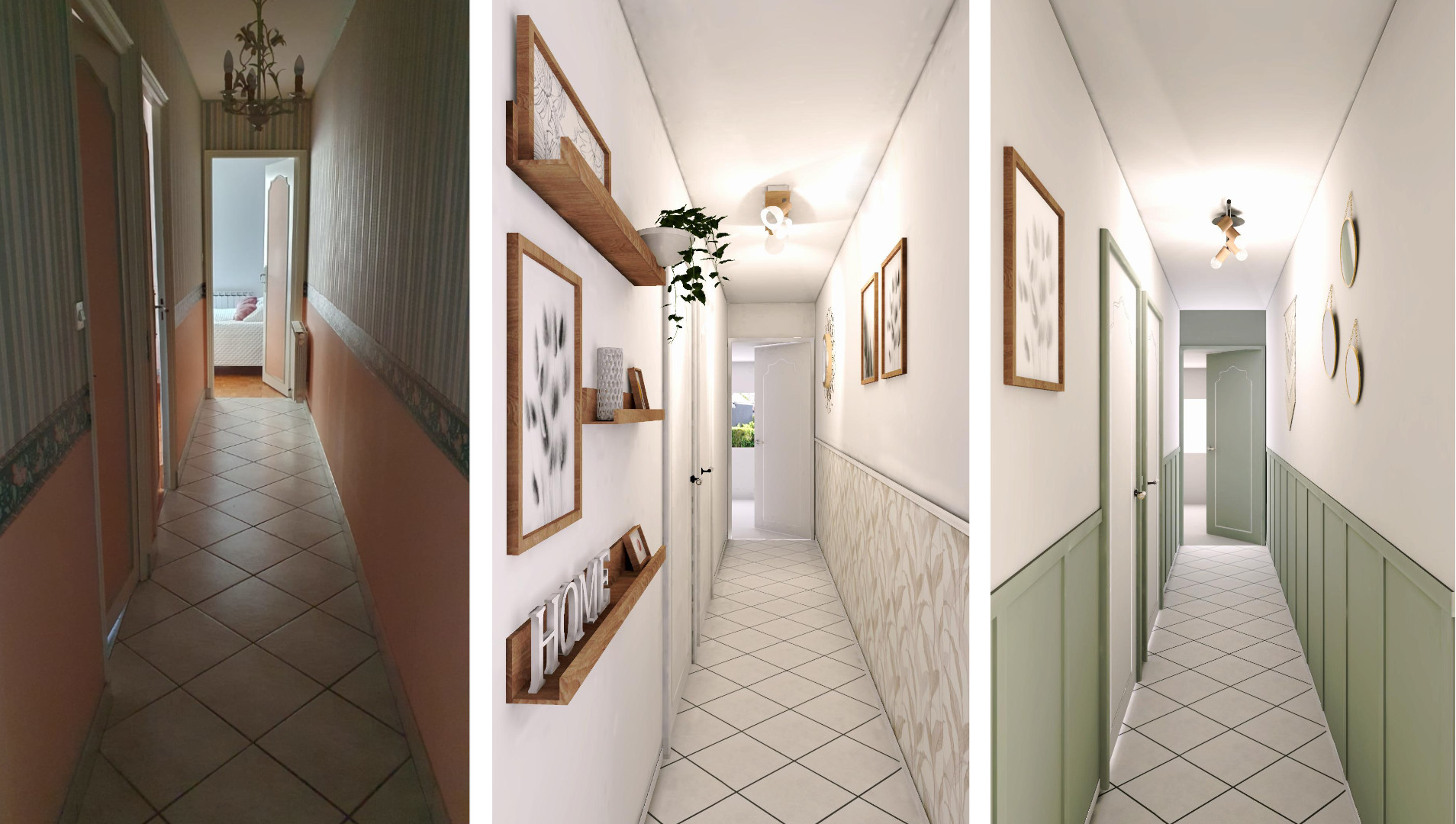 Dans la 1ère proposition, une tapisserie claire et végétale vient ponctuer différents murs, en rappel aux différentes pièces adjacentes de la maison. L’entrée est agrémentée d’un meuble de rangement afin d’organiser chaussures, foulards et sacs à main. Au dessus d’un meuble permettant de s’asseoir, quelques patères afin d’y accrocher le manteau du moment et ceux des invités. Le couloir, étroit et sombre comporte une déco simple, avec des étagères porte-cadre et un miroir. Au plafond, une rampe de spots afin de pouvoir diriger les différentes lumières.