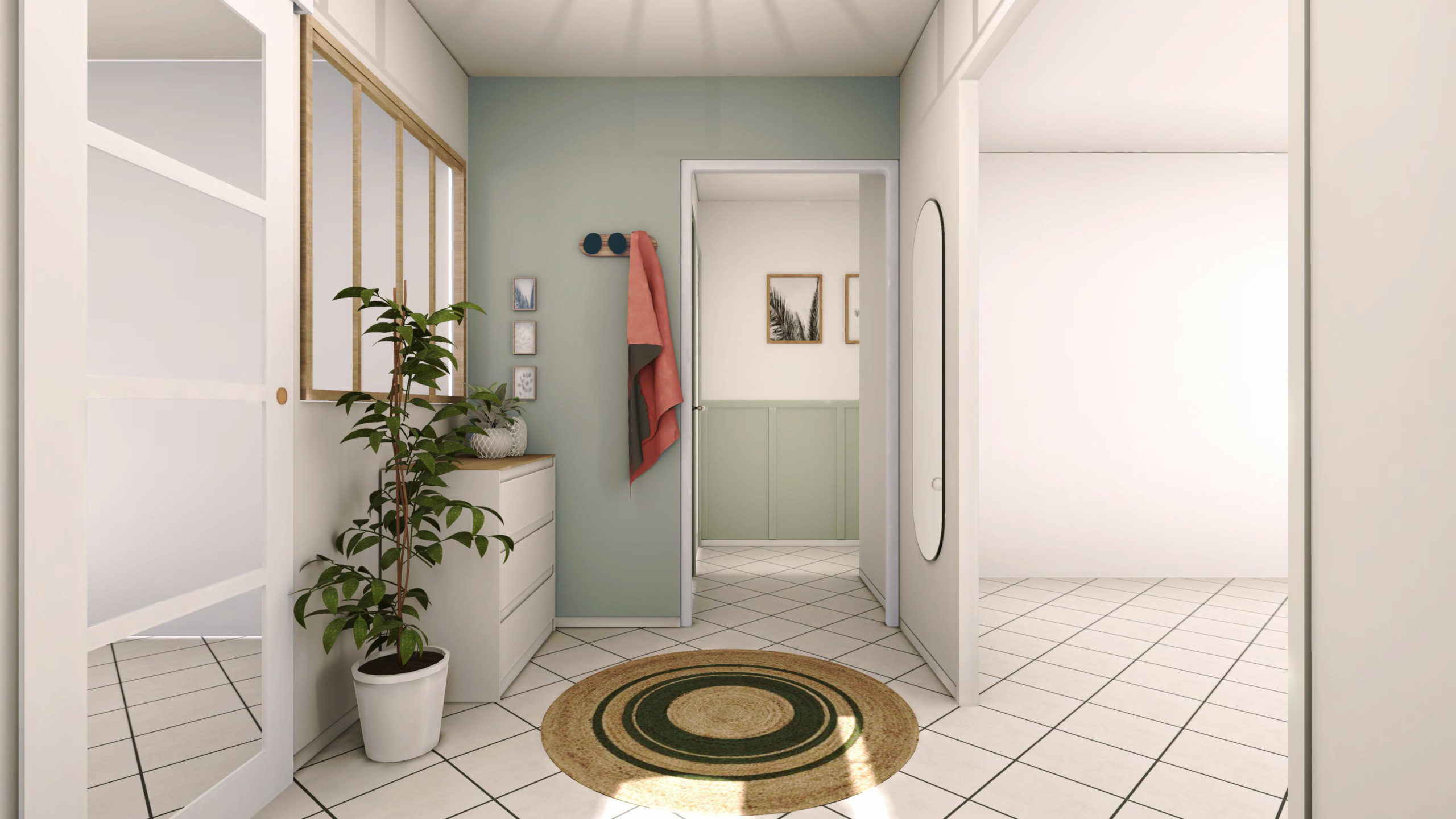 Dans la 2ème proposition, j’ai voulu jouer sur la couleur. Le vert choisi est en rappel avec les menuiseries aluminium de cette maison. Pour apporter plus de clarté j’ai crée un claustra grâce à une verrière ouvert sur la cuisine. Une commode de rangement et un porte manteau pour le rangement de l’entrée, ainsi qu’un grand miroir pour se mirer avant de sortir. Dans le couloir, j’ai placé un sous-bassement en board and batten peint avec la même couleur que dans l’entrée. La porte du fond est également peinte pour donner l’impression de la rapprocher.