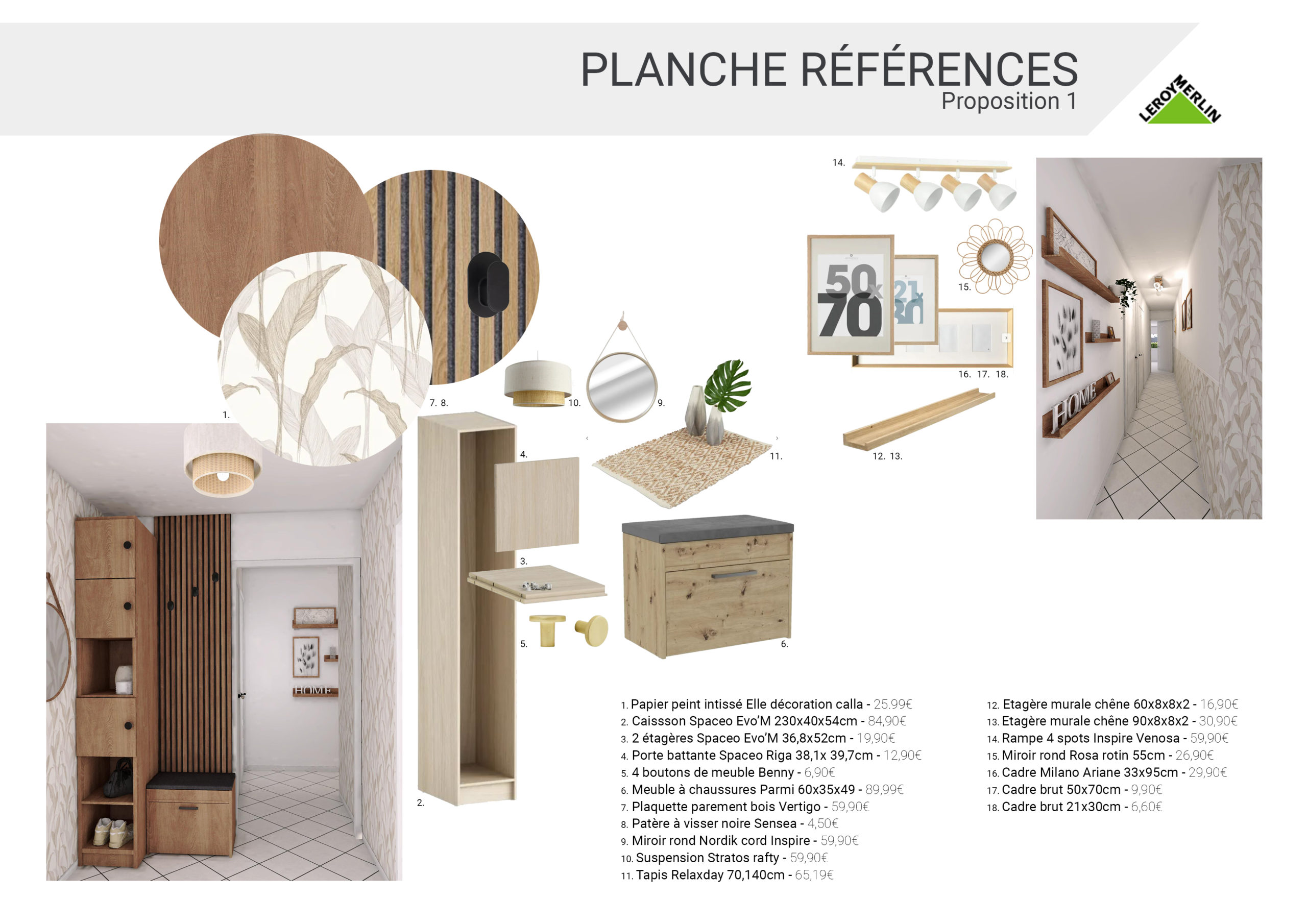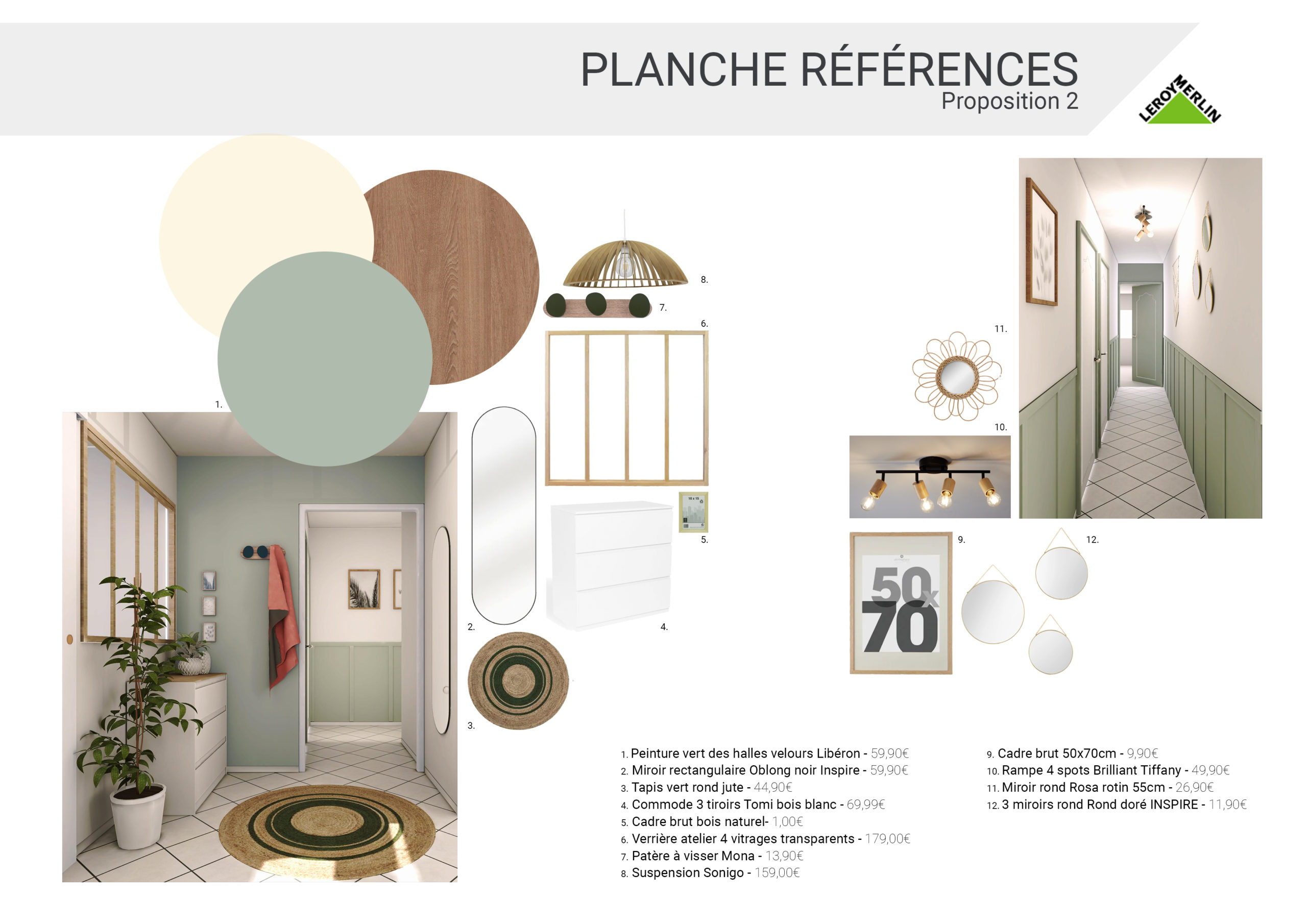 Voici les 2 propositions d’aménagement et de décoration pour l’entrée et le couloir d’un particulier. Le besoin identifié était d’éclaircir et de moderniser ces espaces, et la contrainte était de pouvoir se fournir pour les travaux chez Leroy Merlin.